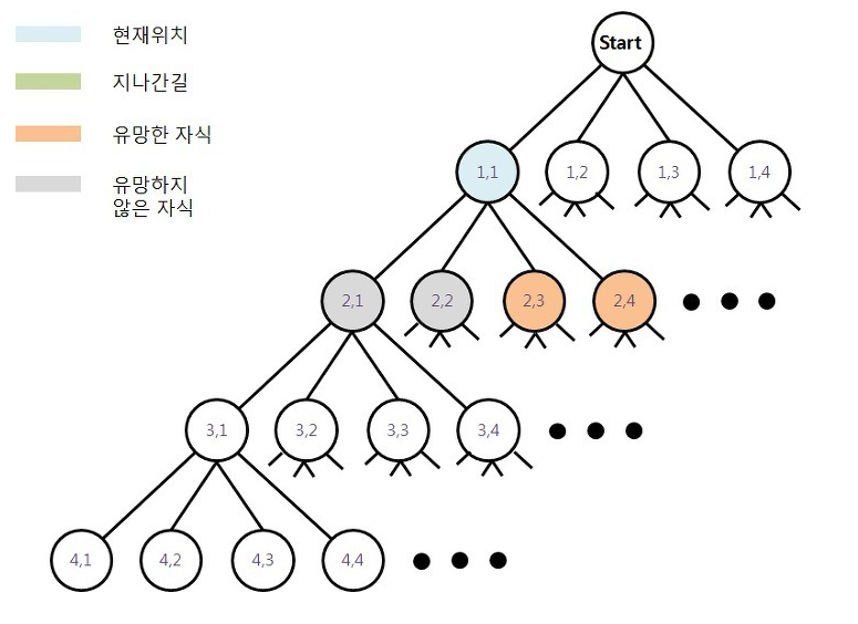 즉 비효율적인 경로를 차단하고 목표지점에 갈수있는 가능성이 있는 루트를 검사하는 방법이 백트래킹 알고리즘이다.